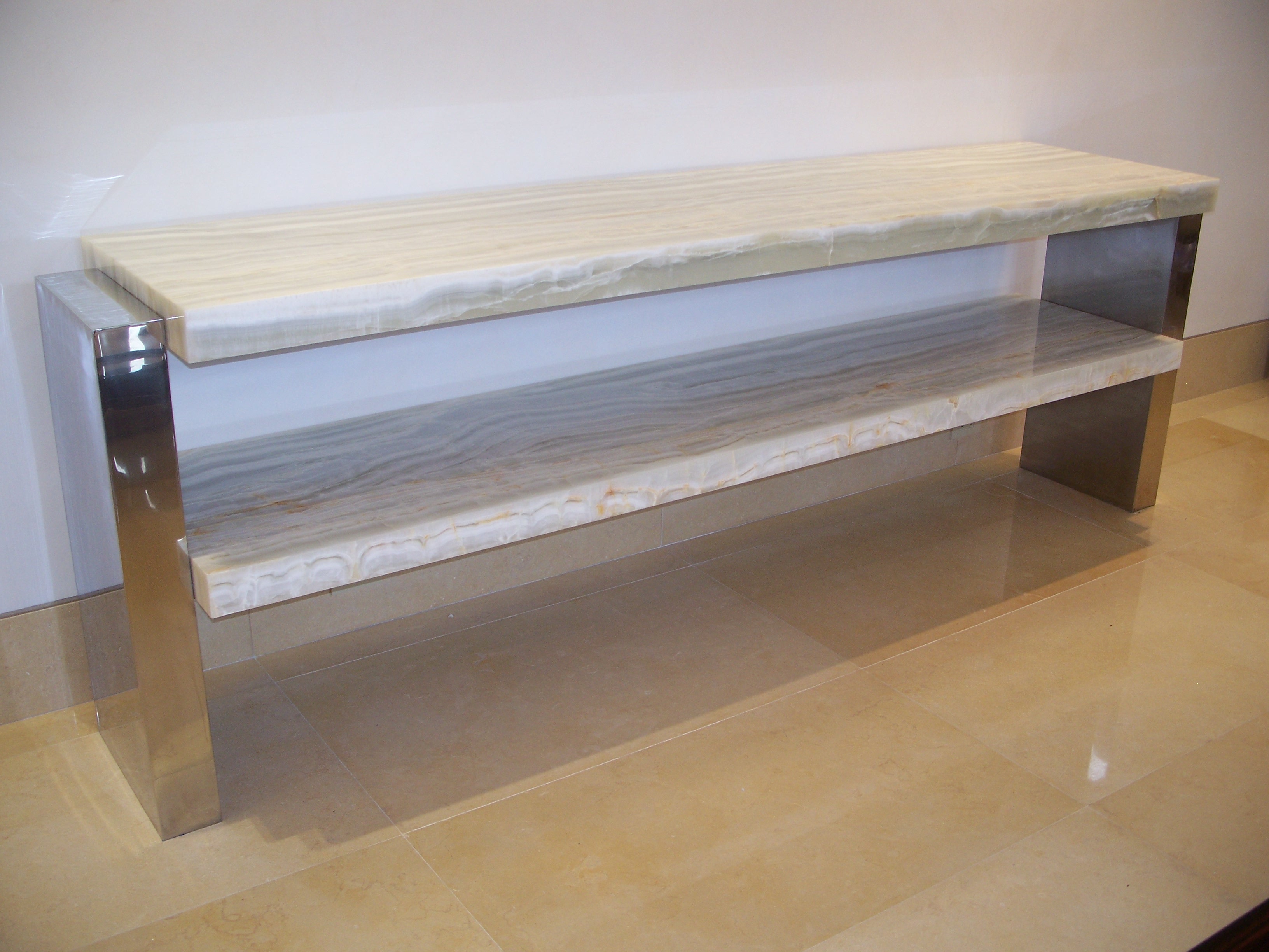 Custom Fabricated Buffet Table in White Onyx and Mirror Polish Steel